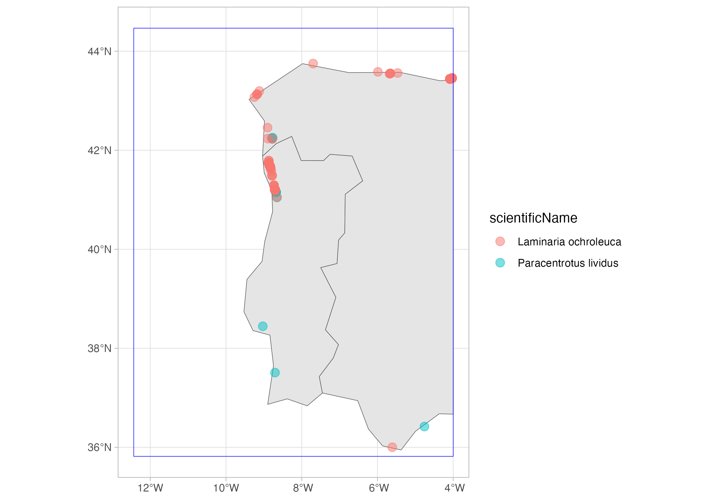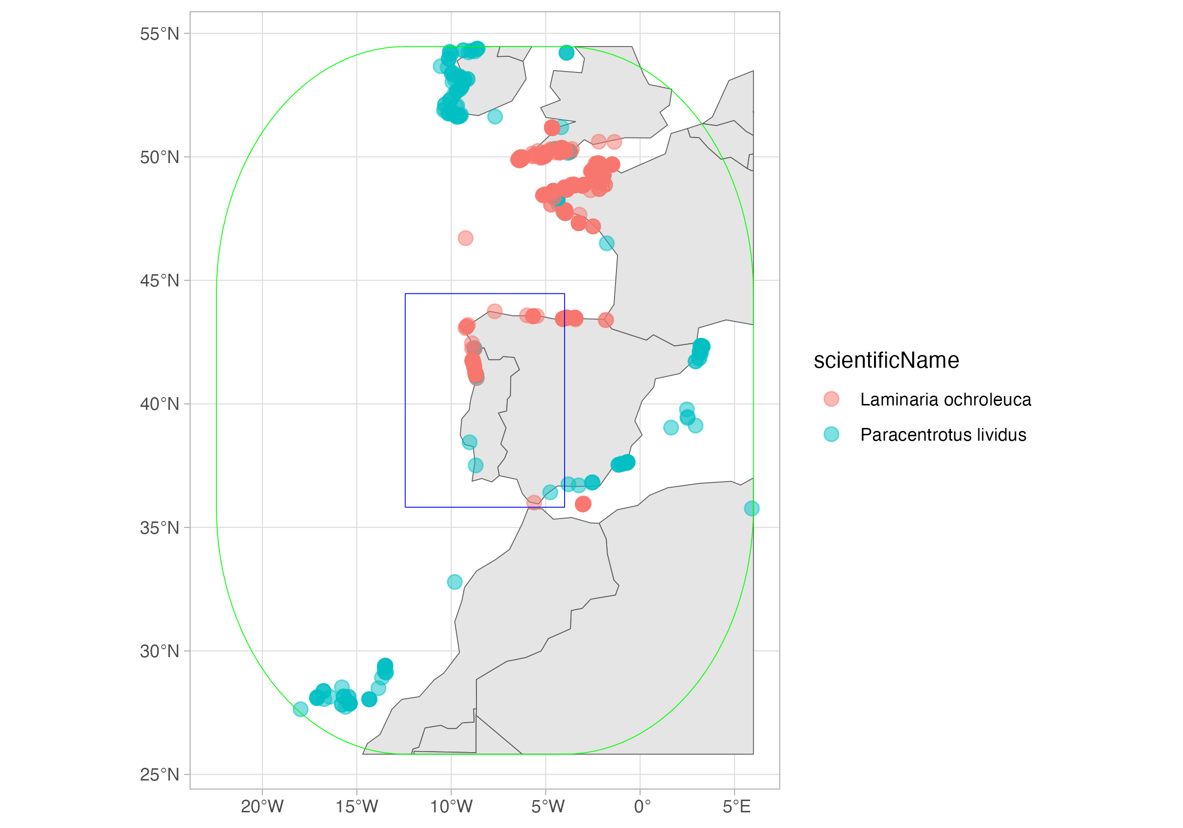 We will get all records for the sea-urchin Paracentrotus lividus and the macroalgae Laminaria ochroleuca on a region in the coast of Portugal and Spain. We will use a WKT (Well-Known Text) representation of a polygon: